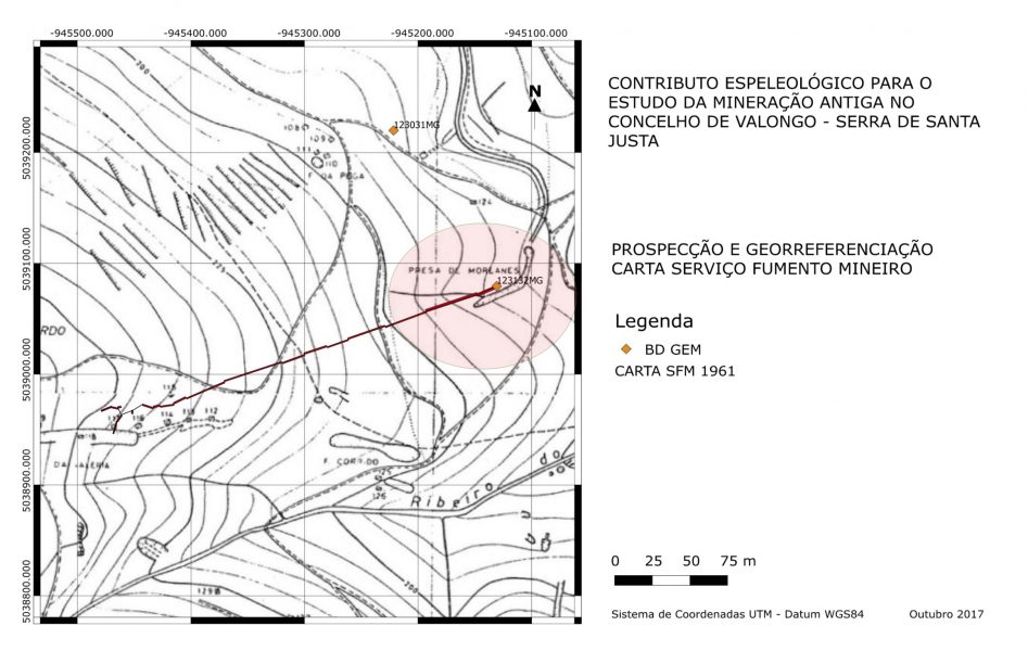 A ausência de registos sobre esta mina tornara-a alvo de cobiça por parte da comunidade espeleológica. No início do milénio, foram realizadas várias tentativas de exploração por parte do extinto GEV (Grupo Espeleológico de Valongo). Porém, os níveis da água nunca permitiram a sua exploração e, mesmo os projetos mais ousados de mergulho ficaram no papel e por realizar. Foi então que, em 2014, aquando da formação do GEM Norte, se iniciaram várias tentativas de exploração da mina, todas elas sem êxito. Contudo, a monitorização do nível da água durante os meses quentes manteve-se. Este ano (2017), devido à seca que se fez sentir em Portugal, a janela de oportunidade finalmente abrira ao fim de décadas. A exploração espeleológica foi realizada dia 12 de outubro. No dia seguinte, concluímos os trabalhos topográficos, fotográficos e de georreferenciação. Assim, estava terminado um ciclo de mistério sobre a «Presa Moreanes». Durante as semanas seguintes, o tempo seco manteve-se, baixando ainda mais os níveis da água. The lack of records on this mine made it a sort of “El Dorado” for the speleological community. At the start of this millennium, various attempts to explore the mine were made by the now-defunct GEV (Grupo Espeleológico de Valongo). But the water levels never allowed it to be explored, and even the most daring projects never got past the planning stage.