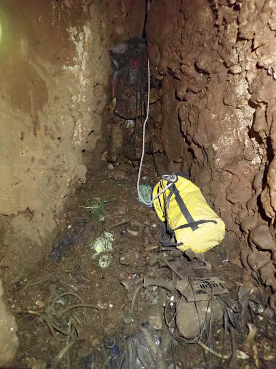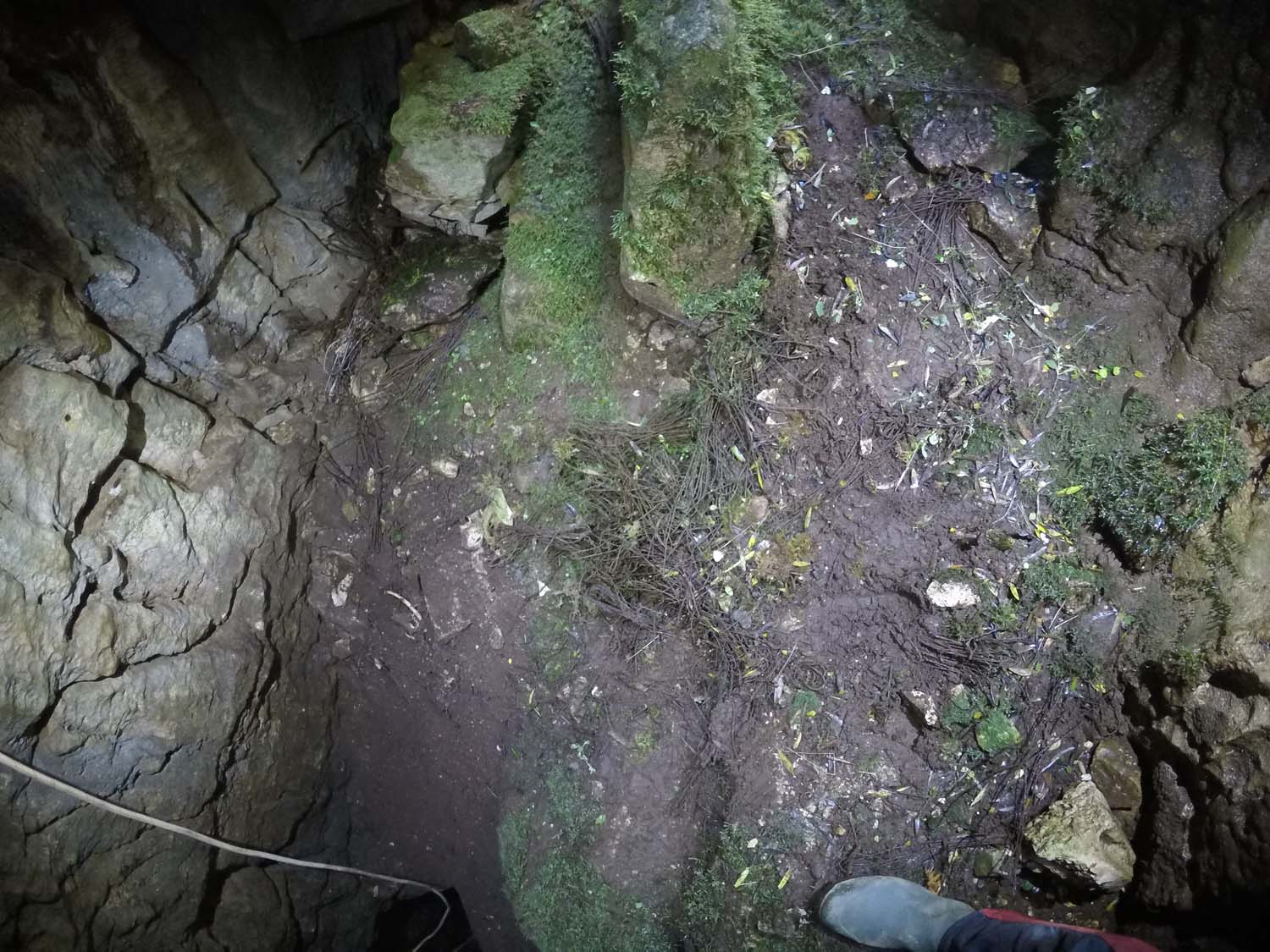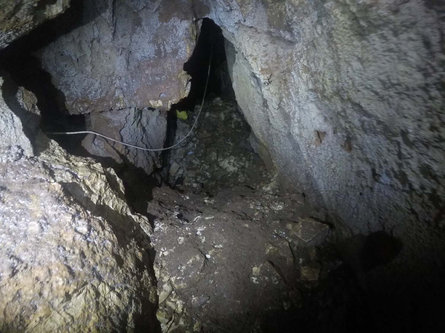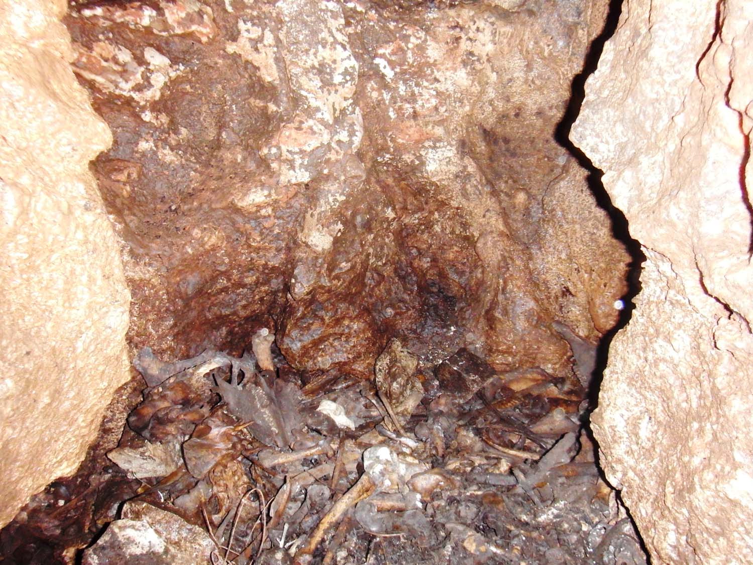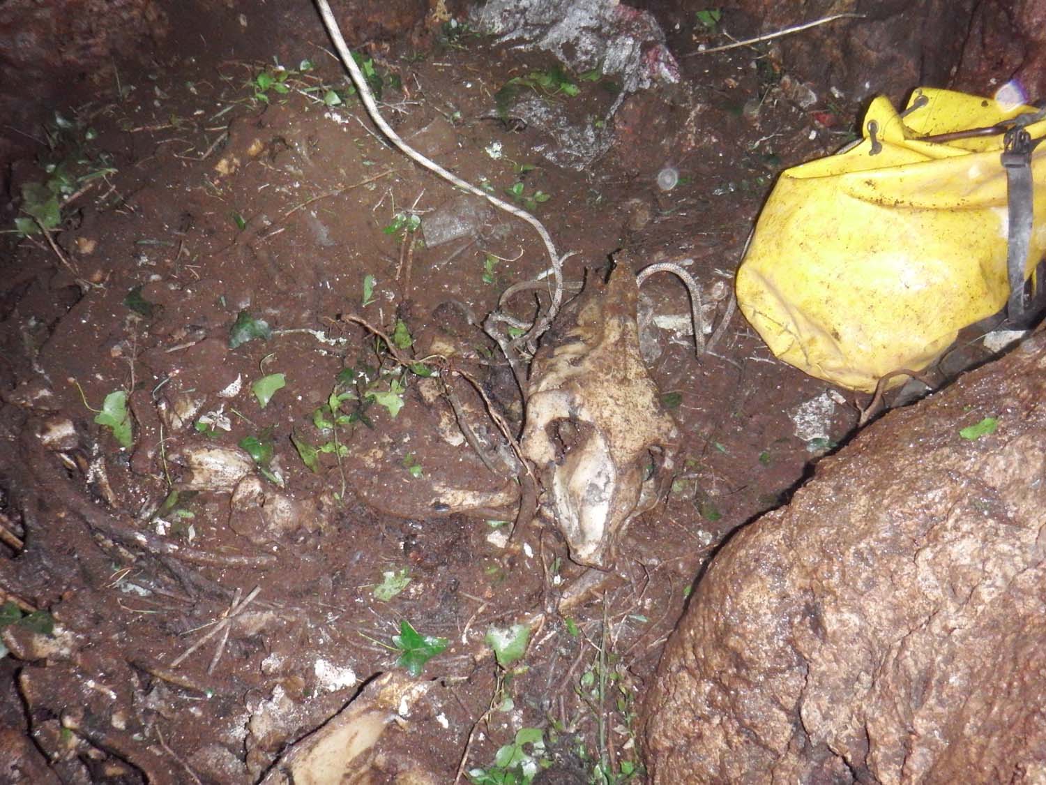 Na mesma sala no sentido NO, temos um pequeno poço de 2m onde termina o algar, com o chão carregado de ossadas e lixo por estar próximo da base do poço de entrada. Visualizamos também junto à base do poço de entrada uma pequena fenda no sentido SSO onde poderá eventualmente haver uma possível continuação, mas o cheiro tornou-se insuportável.