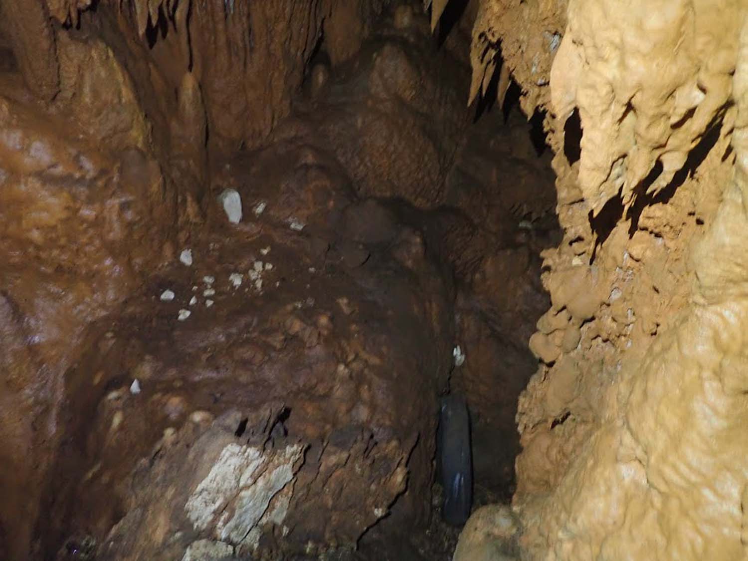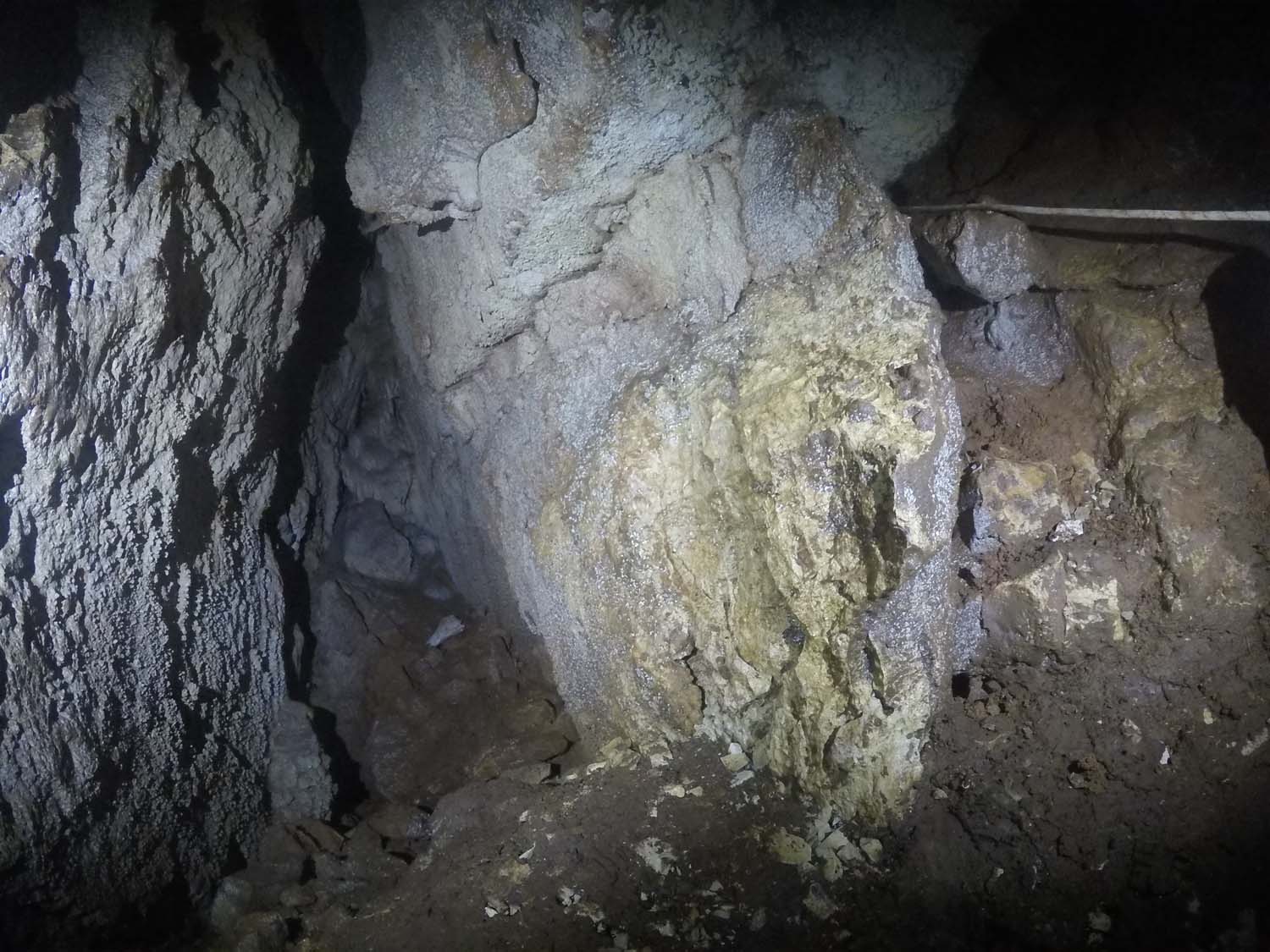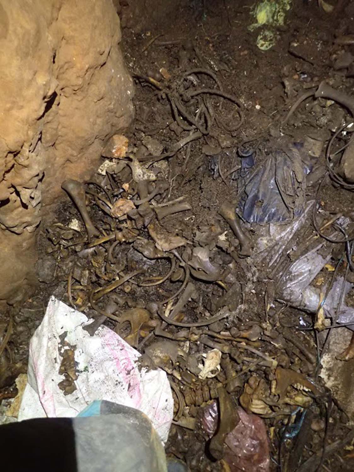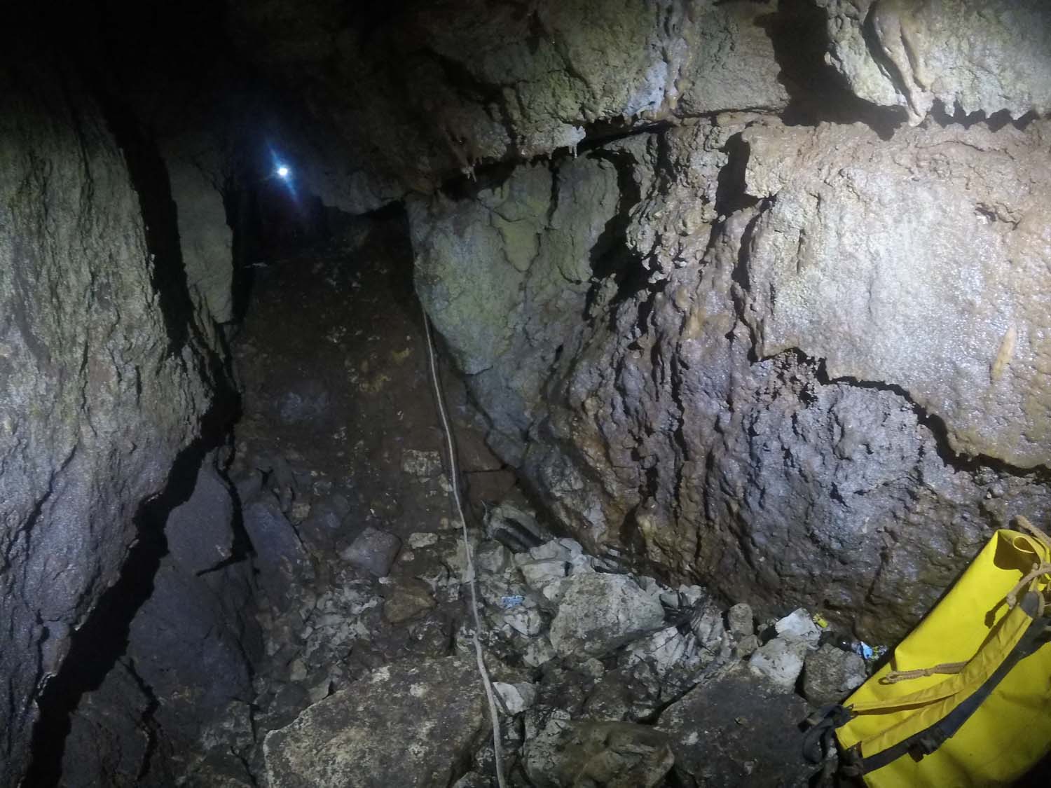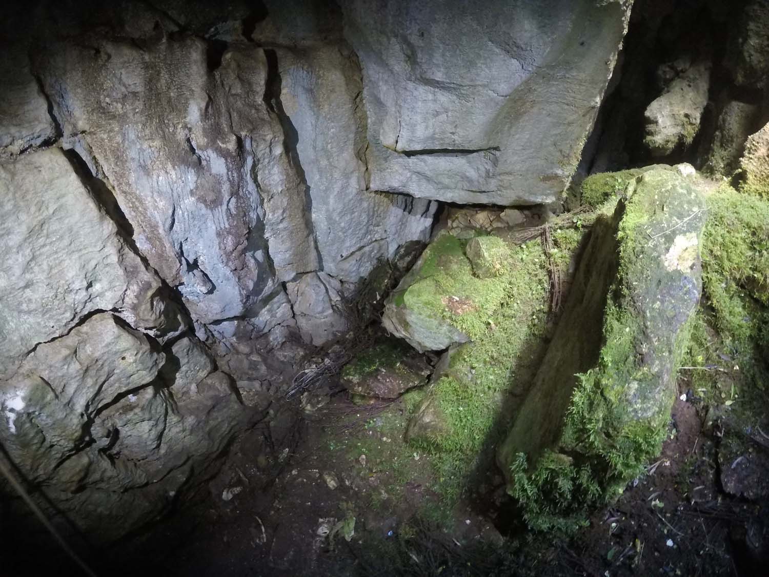 Na mesma sala no sentido NO, temos um pequeno poço de 2m onde termina o algar, com o chão carregado de ossadas e lixo por estar próximo da base do poço de entrada. Visualizamos também junto à base do poço de entrada uma pequena fenda no sentido SSO onde poderá eventualmente haver uma possível continuação, mas o cheiro tornou-se insuportável.