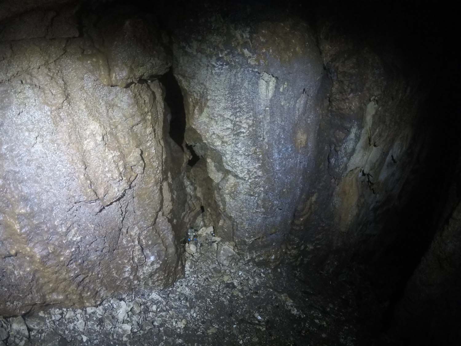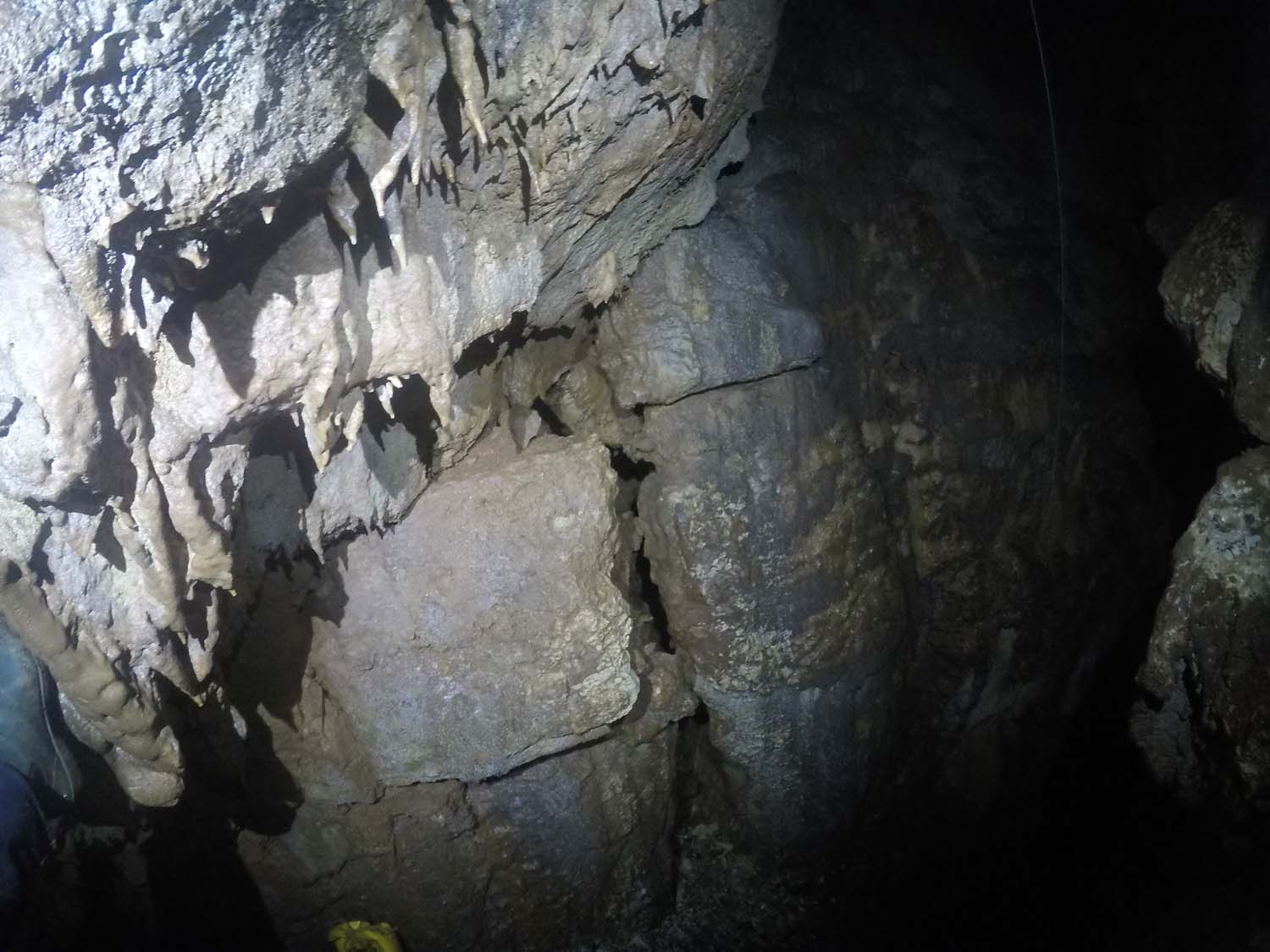 De regresso à base do poço de 4m, agora no sentido E, temos uma zona agora mais apertada e em parte debaixo de caos de blocos. O chão tem um desnível no sentido E, segue-se um pequeno ressalto com cerca de 1,5m, terminando ai o algar em fundo de cascalho. Nota-se uma abertura muito pequena, sensivelmente a meio do ressalto na parede no sentido E, de onde passa ar fresco, para já terminando ai este pequeno algar.