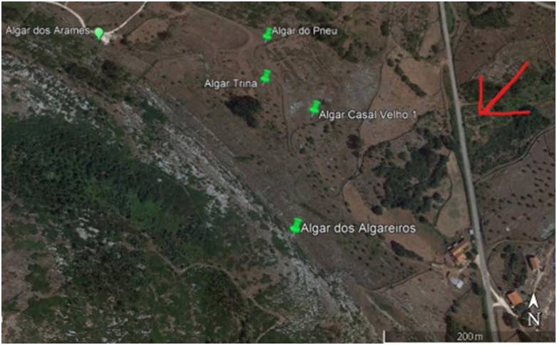Figura 1 – Localização dos algares tendo como referência a estrada que liga Cabeço das Pombas a São Bento (seta vermelha)