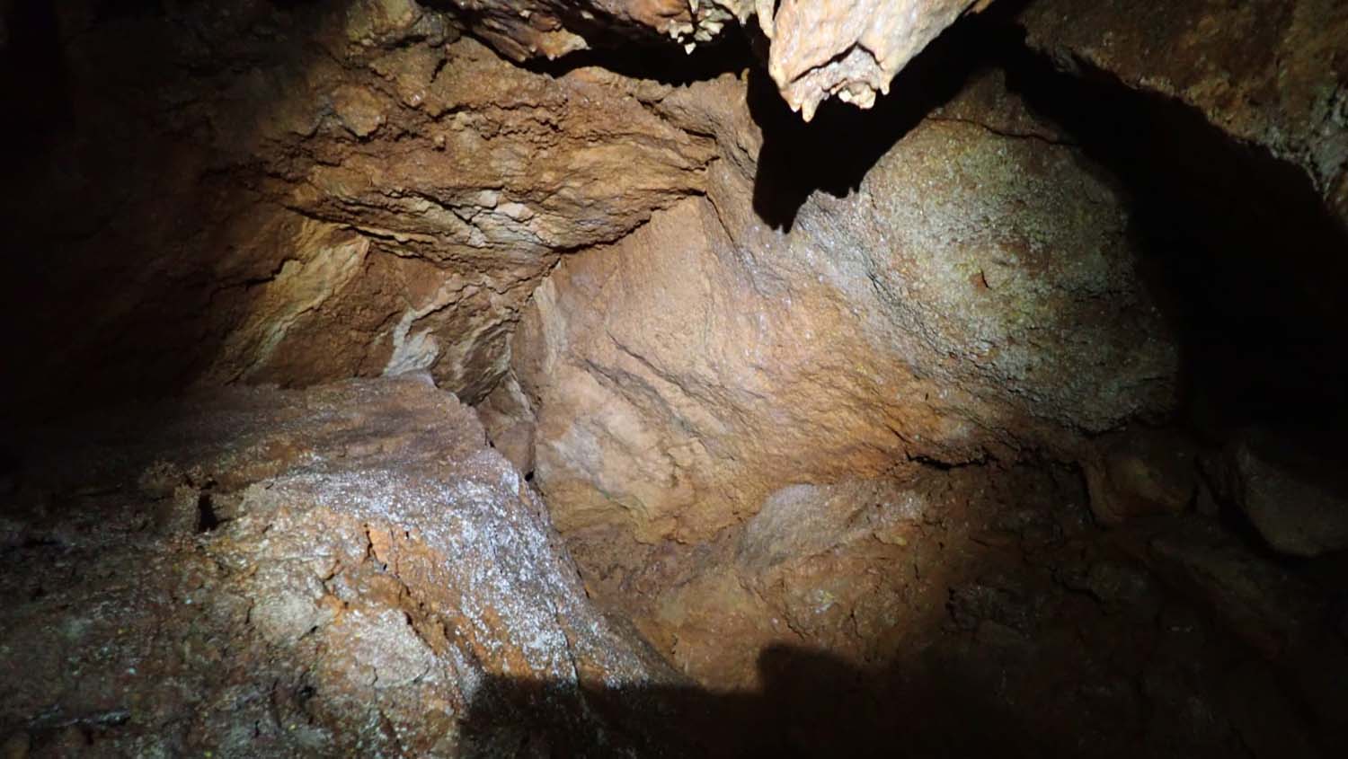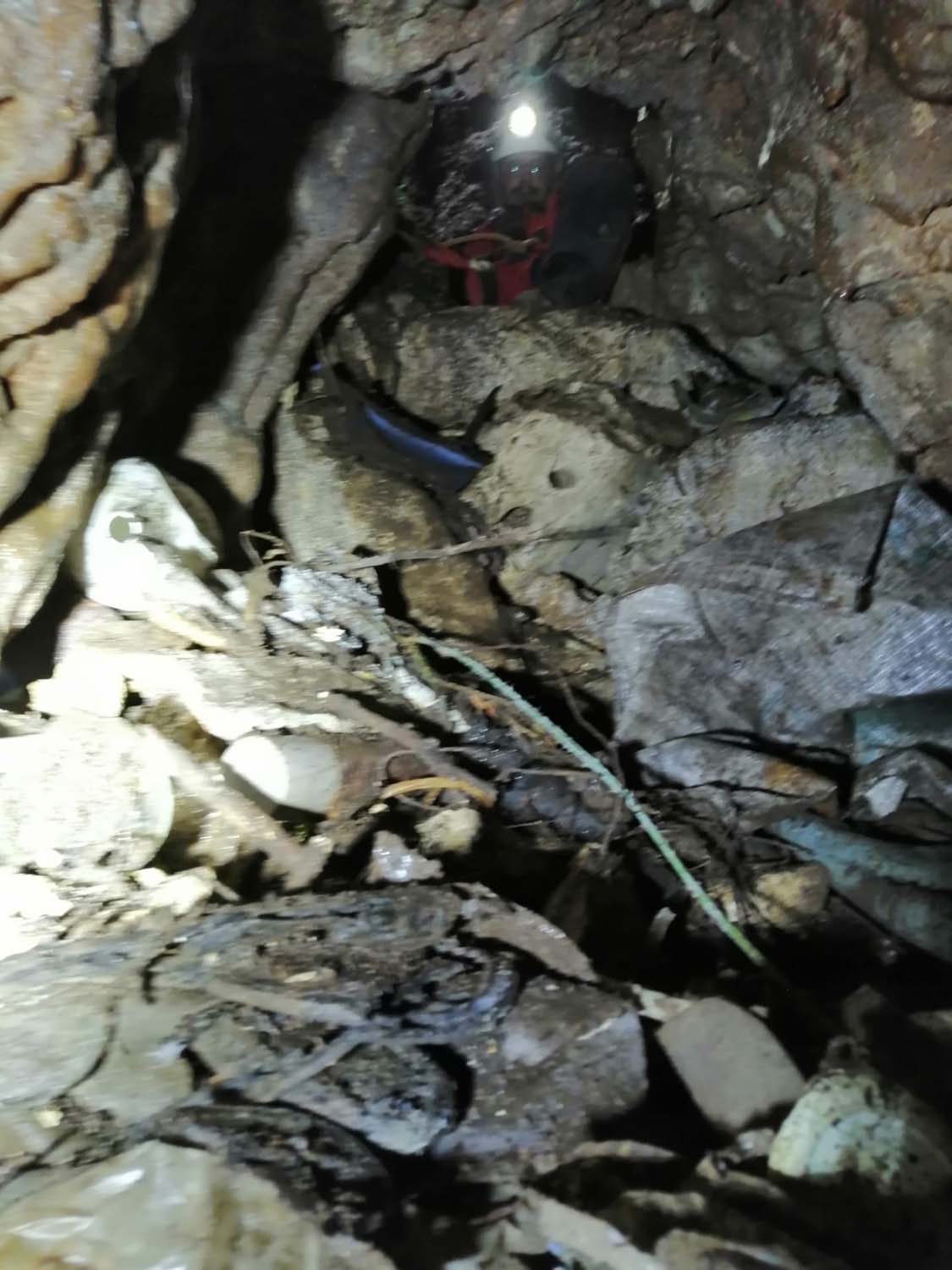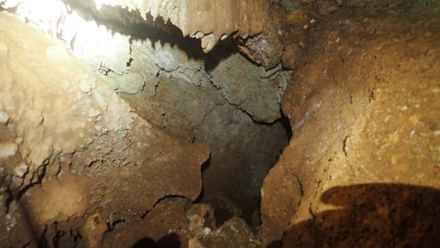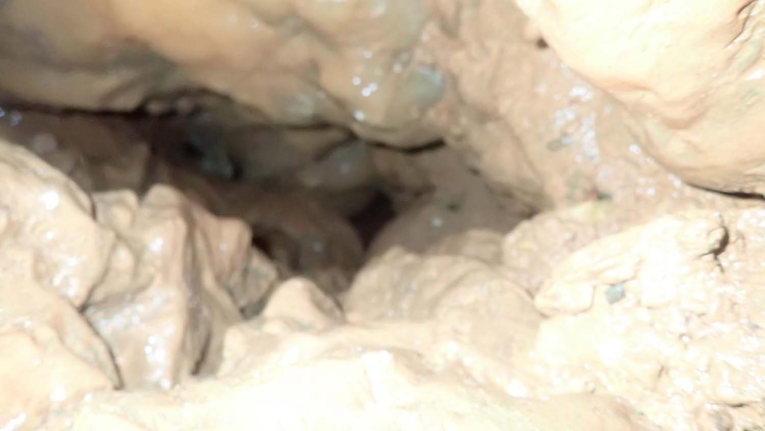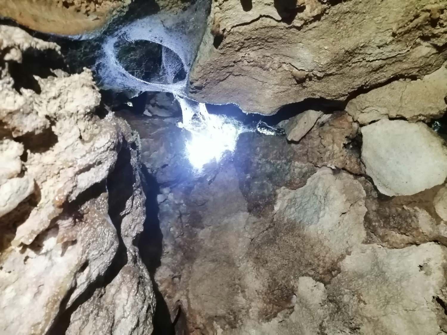 Identificámos também um enorme numero de grandes aranhas protegendo os seus casulos, a sua futura prol. A base é de forte inclinação, tem argila e cascalheira e esta carregada de ossadas de vários animais. Aí percebemos a união dos 2 poços. Um pouco mais à frente ficamos num pequeno patamar onde observamos outro poço de 4m que se desenvolve no sentido SSO e com base de inclinação no mesmo sentido, esta “pejada” de ossadas onde foram identificadas salamandras e vários tipos de insetos. No final deste tramo temos uma pequena abertura no recanto mais a SSO, identificado na topografia.