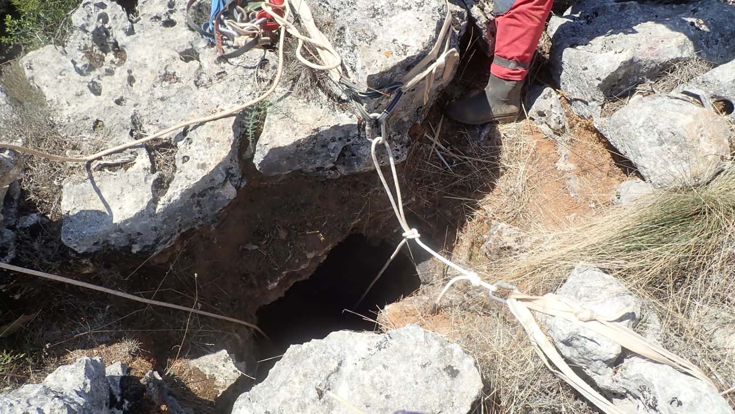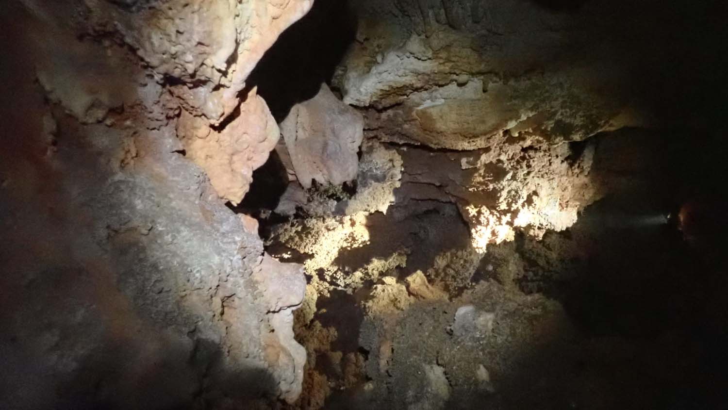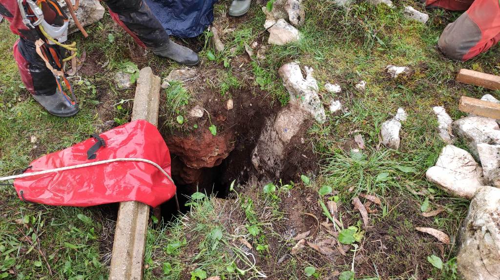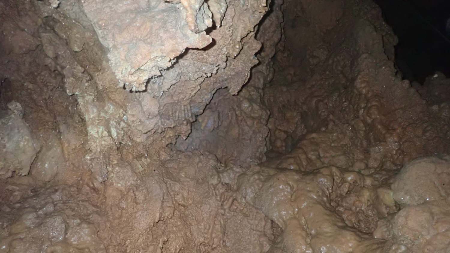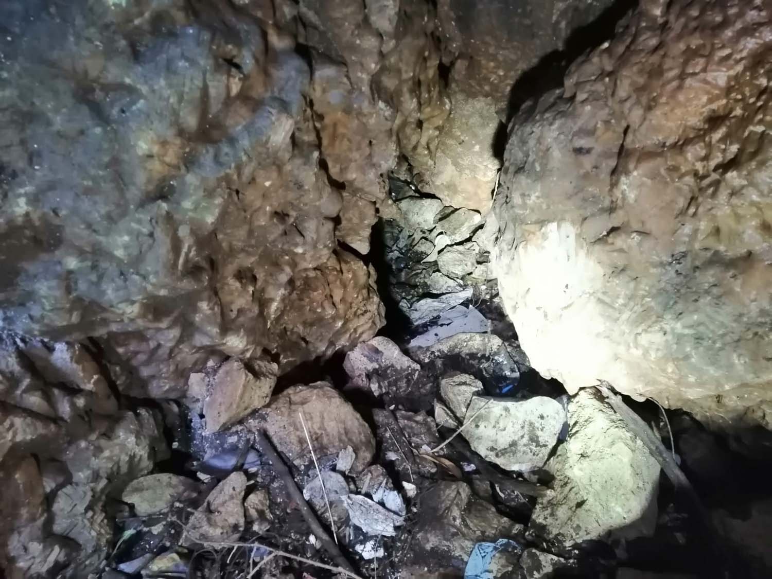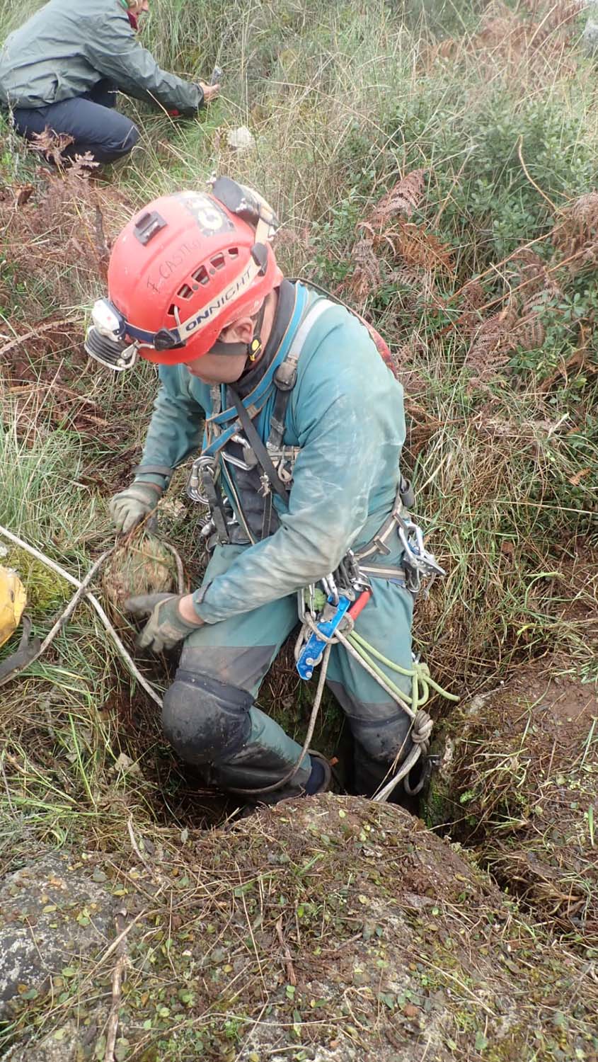 Identificámos também um enorme numero de grandes aranhas protegendo os seus casulos, a sua futura prol. A base é de forte inclinação, tem argila e cascalheira e esta carregada de ossadas de vários animais. Aí percebemos a união dos 2 poços. Um pouco mais à frente ficamos num pequeno patamar onde observamos outro poço de 4m que se desenvolve no sentido SSO e com base de inclinação no mesmo sentido, esta “pejada” de ossadas onde foram identificadas salamandras e vários tipos de insetos. No final deste tramo temos uma pequena abertura no recanto mais a SSO, identificado na topografia.