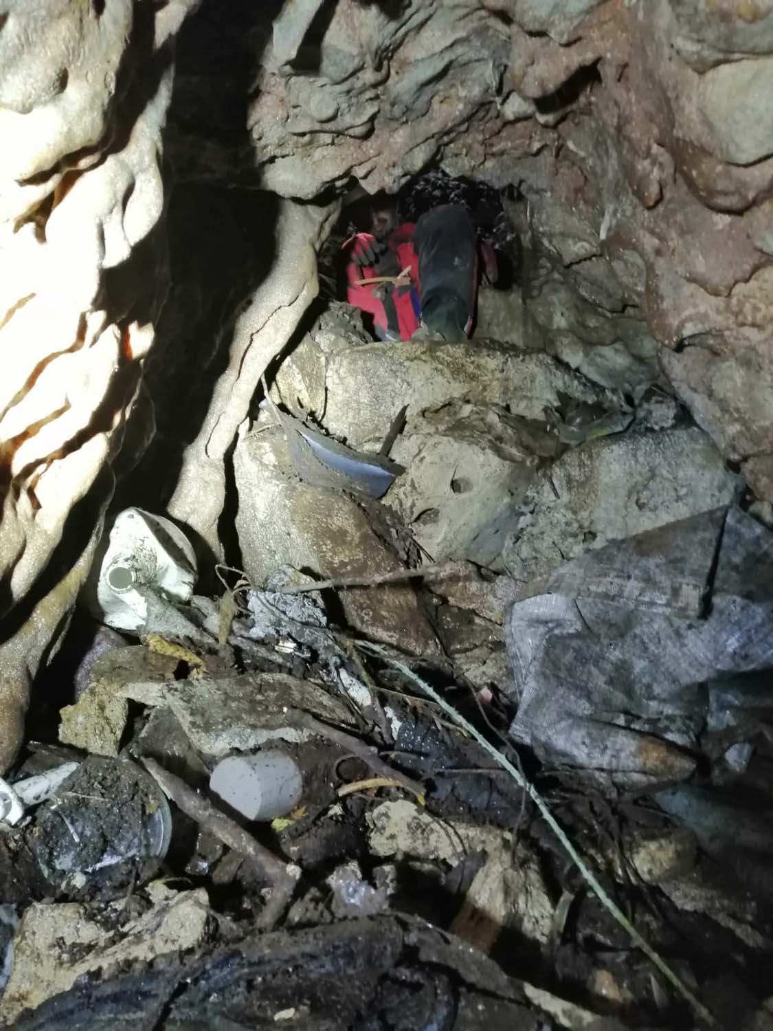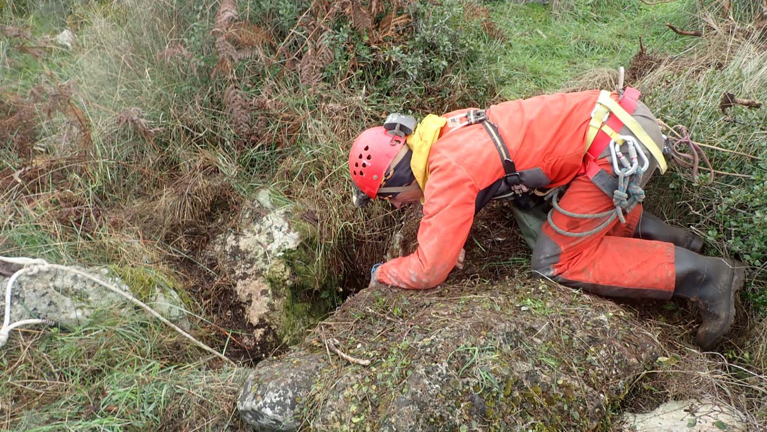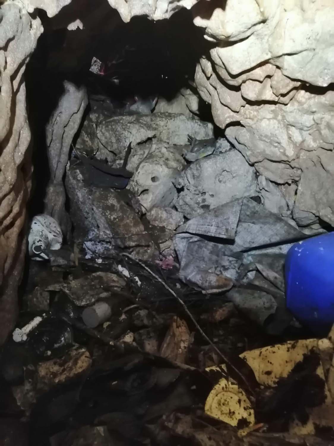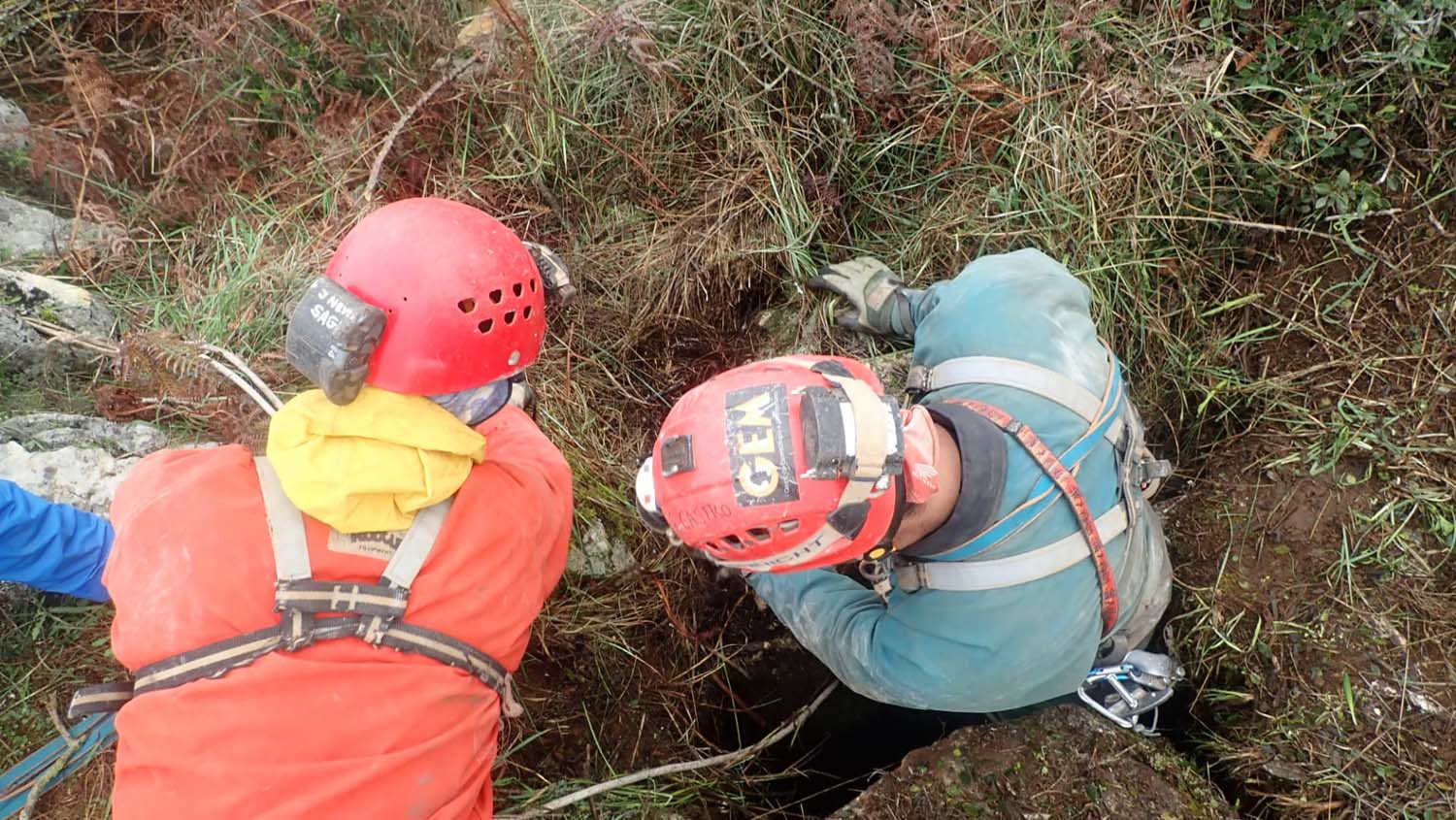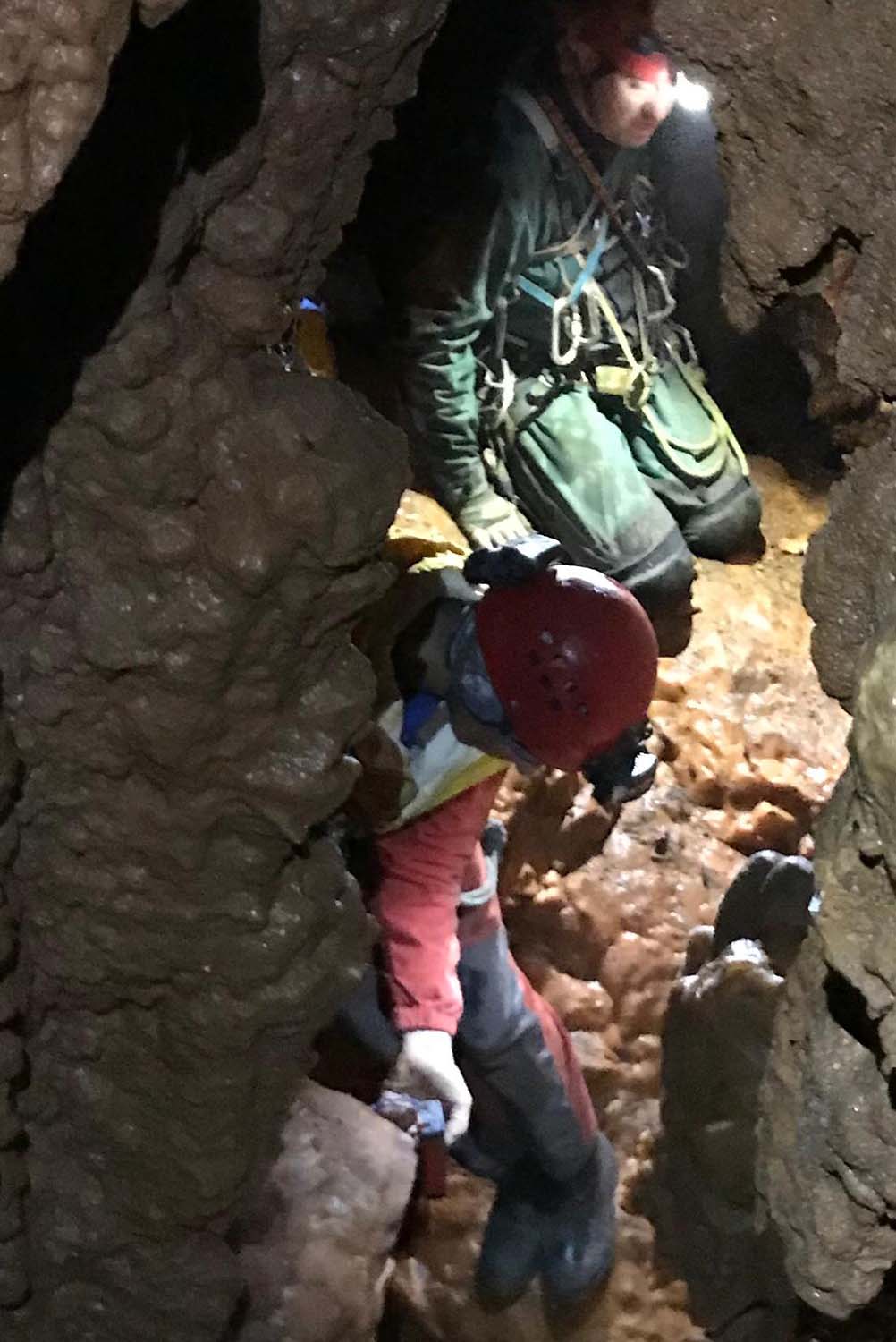 Identificámos também um enorme numero de grandes aranhas protegendo os seus casulos, a sua futura prol. A base é de forte inclinação, tem argila e cascalheira e esta carregada de ossadas de vários animais. Aí percebemos a união dos 2 poços. Um pouco mais à frente ficamos num pequeno patamar onde observamos outro poço de 4m que se desenvolve no sentido SSO e com base de inclinação no mesmo sentido, esta “pejada” de ossadas onde foram identificadas salamandras e vários tipos de insetos. No final deste tramo temos uma pequena abertura no recanto mais a SSO, identificado na topografia.