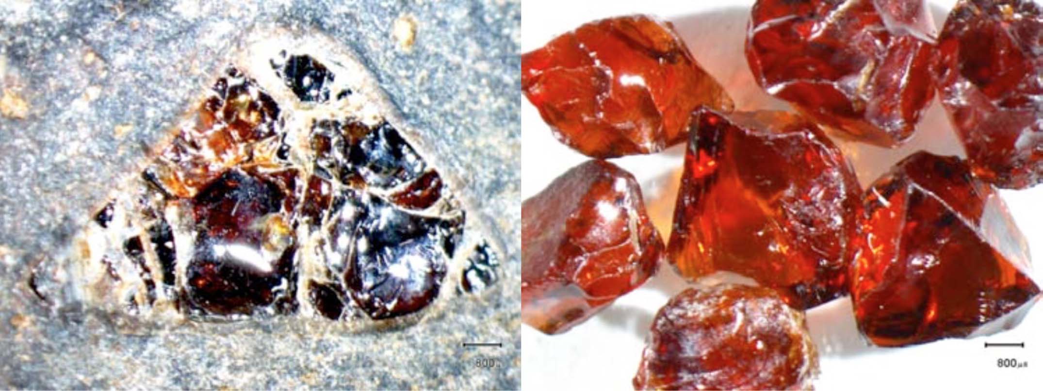 Figura 2 – Dois aspectos de granadas do Monte Suímo, o primeiro na rocha encaixante e o segundo de fragmentos de cristal soltos da rocha.